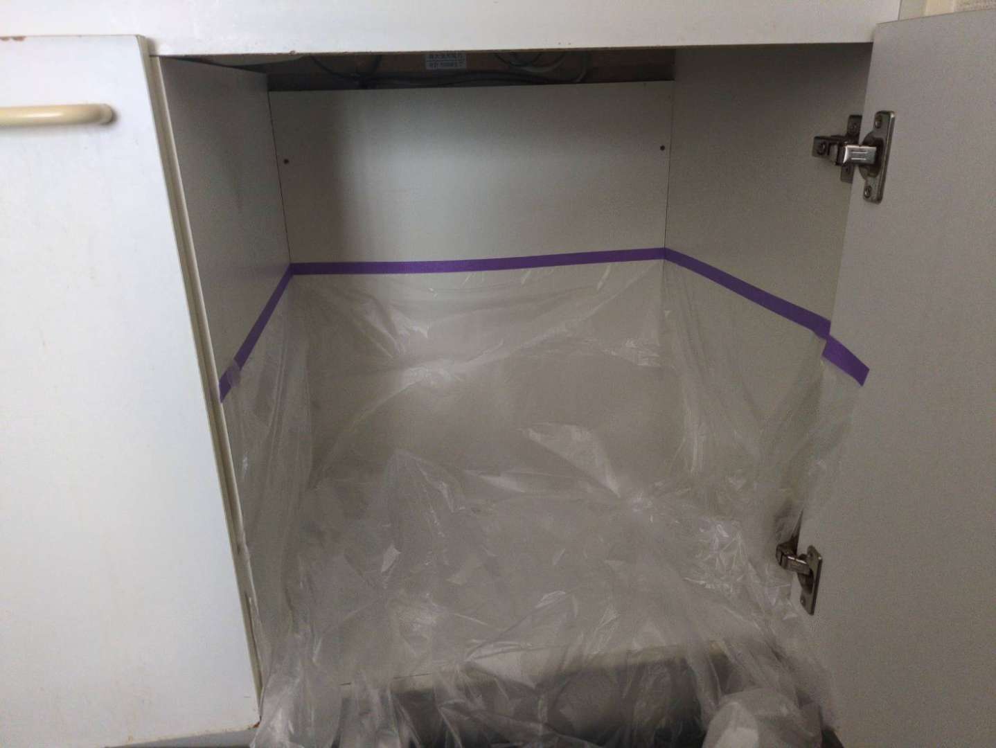 掃除作業中に汚れや水、ホコリが床や壁、棚の中などに付着したり傷つけたりしないよう、保護シートやテープでしっかり覆っています。
