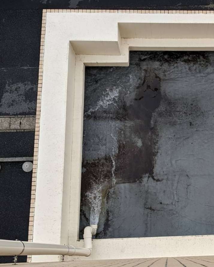 バルコニーの排水部のつまりが原因で共用廊下が浸水…