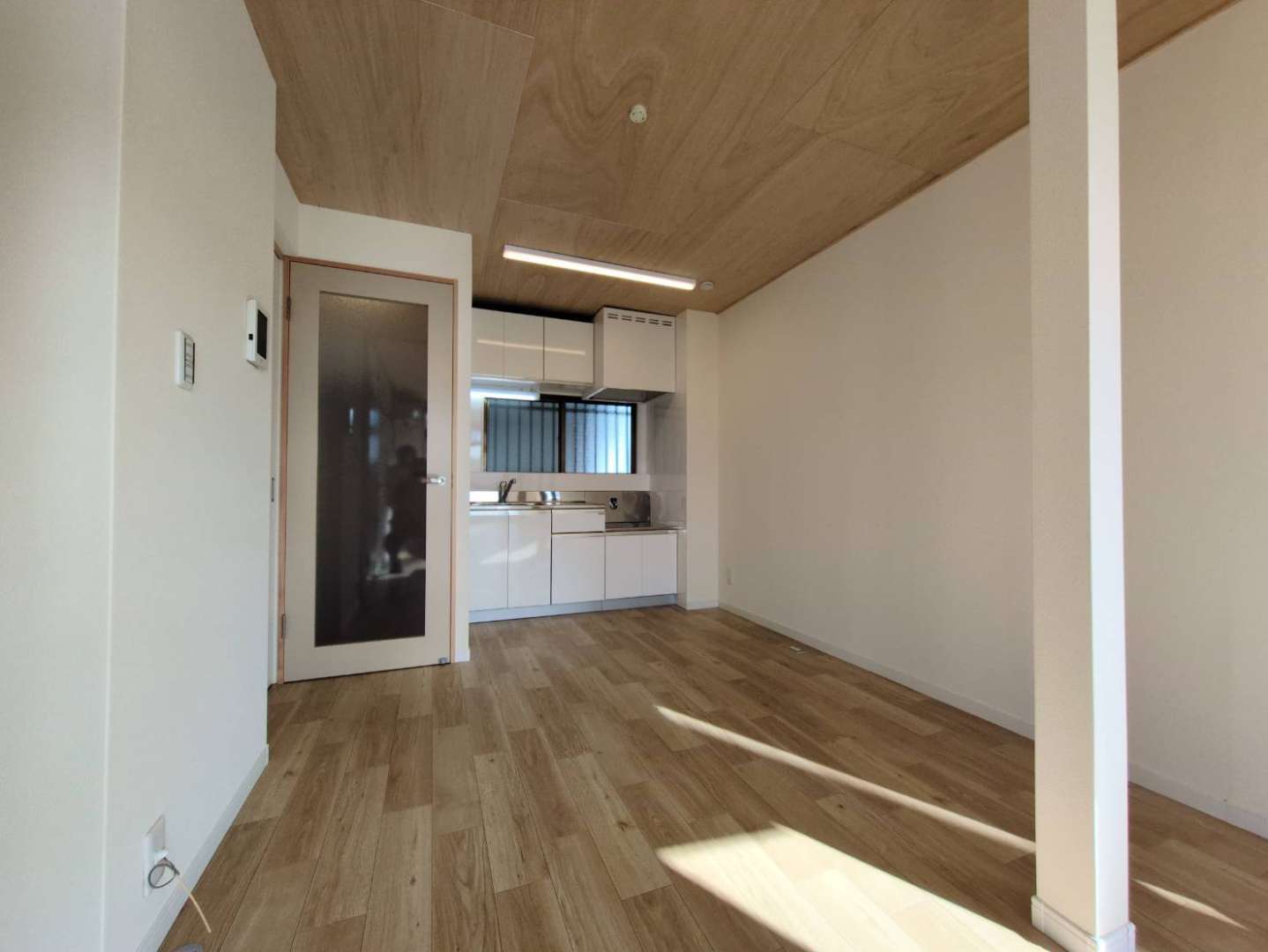 リビング入口のベージュのドアとキッチン上の天井がオシャレのポイントです♪