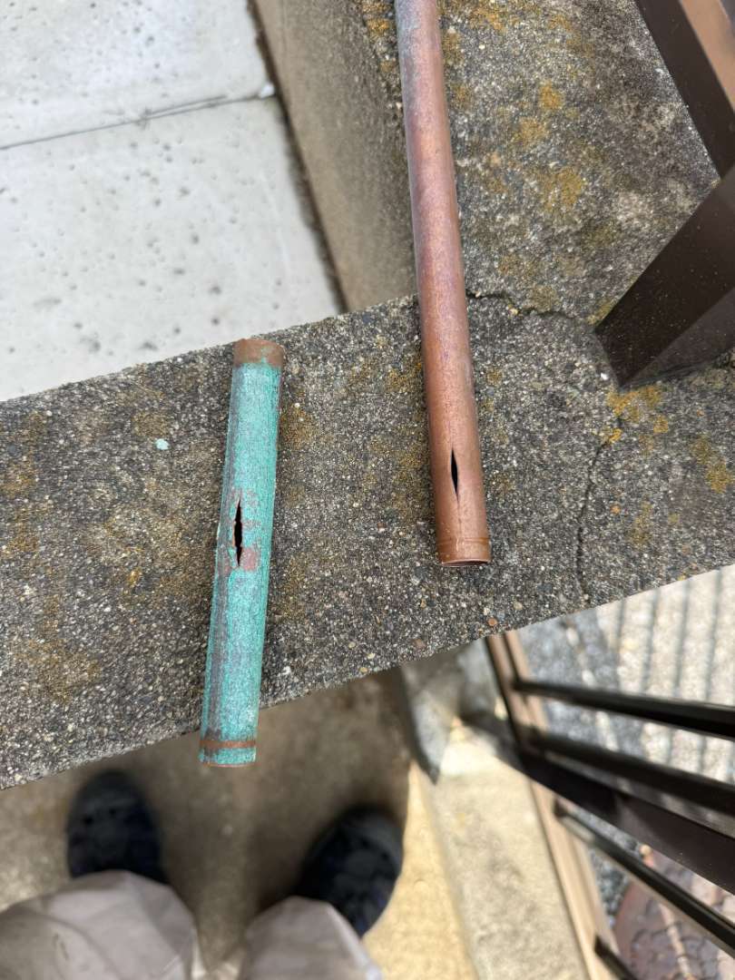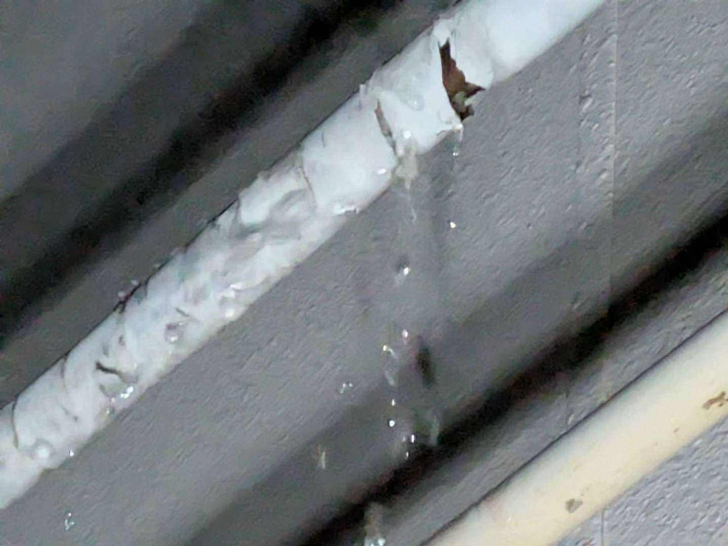 経年劣化と寒さで菅の中の水が凍って膨張し管に穴が空いてしまったかと思われます。